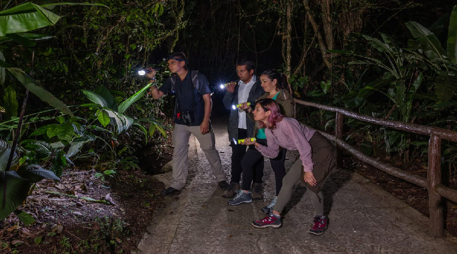 Antes de iniciar la caminata de 2 horas, el guía naturalista le proporcionará una linterna y reglas de seguridad, luego iniciara la aventura a pie por un sendero que bordea unos estanques que facilitan la observación de la vida nocturna mientras aprende importantes características de los ecosistemas y sus hábitats. Incluso conocerá distintas aves y mamíferos nocturnos y si es posible también la rana más simbólica de Costa Rica: la rana arborícola de ojos rojos.
